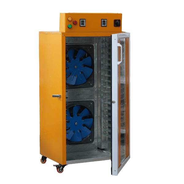 • ابعاد و طراحی: ارتفاع دستگاه ۱۱۰ سانتی‌متر، عرض ۵۵  و عمق آن ۵۰ سانتی‌متر است که در کارگاه‌های کوچک و بزرگ به راحتی جای می‌گیرد. همچنین، امکان جابجایی آسان دستگاه توسط چرخهای تعبیه شده وجود دارد. ۱۸ سینی با ابعاد ۳۲×۴۸ سانتی‌متر درون کابین قرار می‌گیرند.