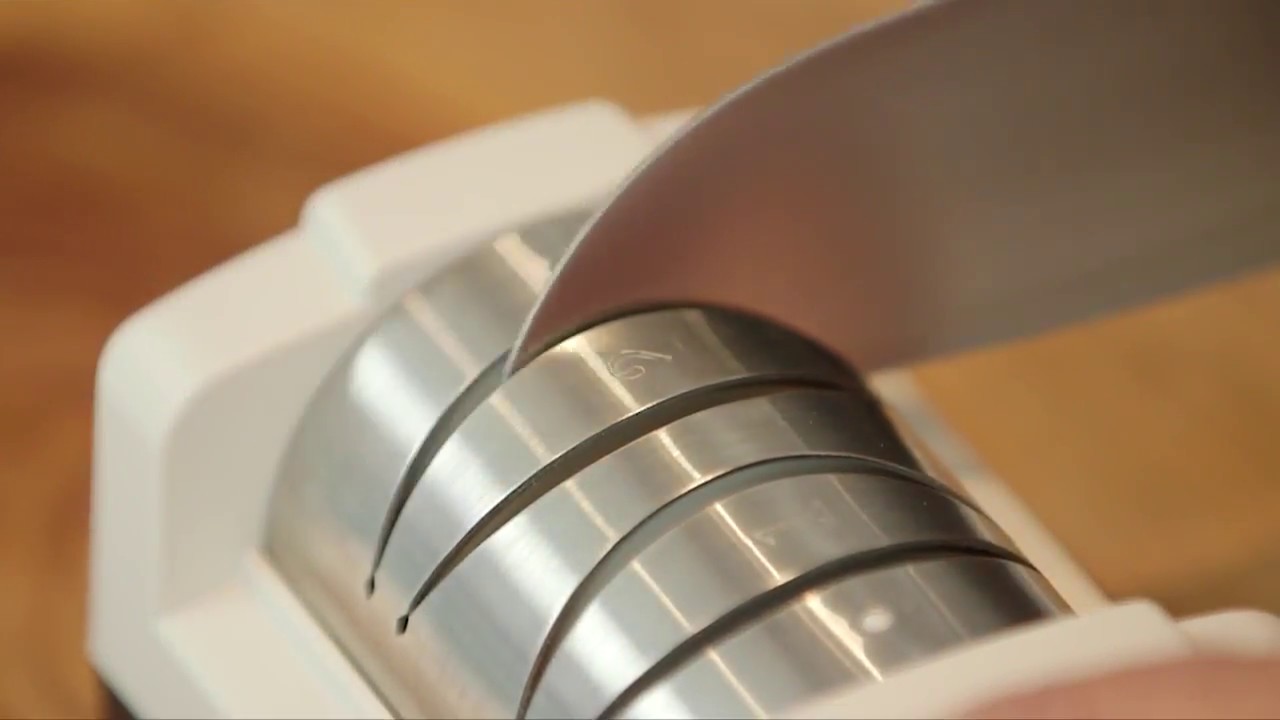 این مدل از دو سنباده مدور با پوشش اکسید آلومینیوم قرار دارد: یکی زبر برای تیز کردن و دیگری نرم برای صیقل نهایی. اما نکته جادویی در اینجاست: هر دو سنباده روی فنرهایی دقیق و حساس سوار شدهاند؛ یعنی اینکه میزان فشار بر اساس ضخامت تیغه تنظیم میشود. اگر با چاقوی ظریف مثل چاقوی پوستکن یا فیلهبر کار میکنید، سنبادهها ملایم عمل میکنند؛ و اگر با ساطور یا چاقوی سرآشپز روبهرو هستید، فشار بیشتری وارد میشود. همهچیز هوشمندانه و بدون دخالت شما تنظیم میشود. در هر چرخ سنباده، دو شیار وجود دارد؛ یکی برای سمت راست تیغه و یکی برای سمت چپ. نکته جالب اینجاست که شما میتوانید انتخاب کنید فقط یک طرف تیغه تیز شود؛ چیزی که برای چاقوهای خاص مثل چاقوی ساشیمی یا نان کاملاً ضروریست، چون این چاقوها فقط در یک سمت زاویه دارند. زاویه برش در هر شیار ۱۵ درجه است؛ زاویهای که ظرافت و دقت فوقالعادهای ایجاد میکند. با این طراحی، شما تیغهای خواهید داشت که هم دقیق برش میزند، هم ماندگاری بالایی دارد. در واقع، طبق تستها، تیزی لبه چاقو بعد از استفاده از KE-198 تا ۱۰ برابر بیشتر از روشهای دستی باقی میماند.