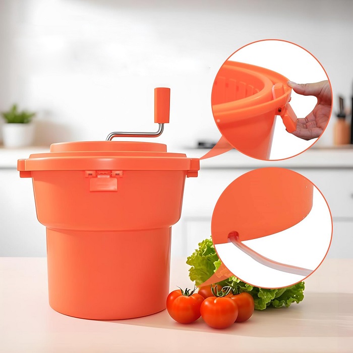 بدنه این دستگاه از پلاستیک فشرده ساخته شده و درون آن هم سبدی پلاستیکی قرار دارد که سبزیجات درون سبد داخلی قرار میگیرند و آب حاصل از چرخش، از طریق روزنههای روی آن خارج میشود. در سطل بیرونی نیز مسیری برای خروج آب تعبیه شده تا در مخزن باقی نماند و بهراحتی تخلیه شود. فرآیند خشککردن با استفاده از دستگیرهای که روی درپوش قرار دارد انجام میشود. این دستگیره با طراحی ارگونومیک و پوشش پلاستیکی، در محور مرکزی سبد داخلی محکم شده و با چندبار چرخاندن آن، سبد با سرعت میچرخد و آب اضافی سبزیجات گرفته میشود. چرخش سبد به کمک دو بخش انجام میشود: حرکت دستگیره و محور دندهای شکل که دستگیره درون آن قرار میگیرد. این سیستم باعث میشود چرخش نرمتر، سریعتر و مؤثرتر انجام شود و سبزیها بدون آسیب، بهطور کامل خشک شوند.